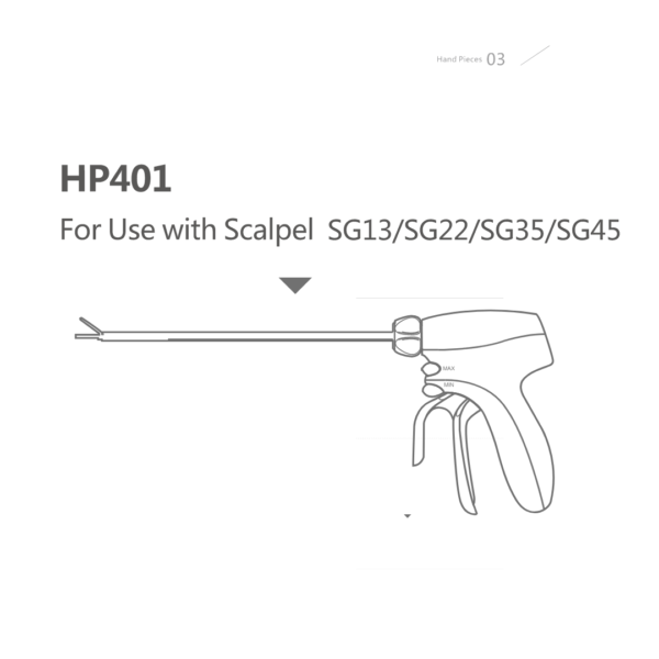 The hand piece is available in two models – HP401 and HP501 – for use with gun-style scalpels (SG) and scissor-style scalpels (SS). The two handles are designed to meet the varied surgical tool needs of different departments and surgeons.